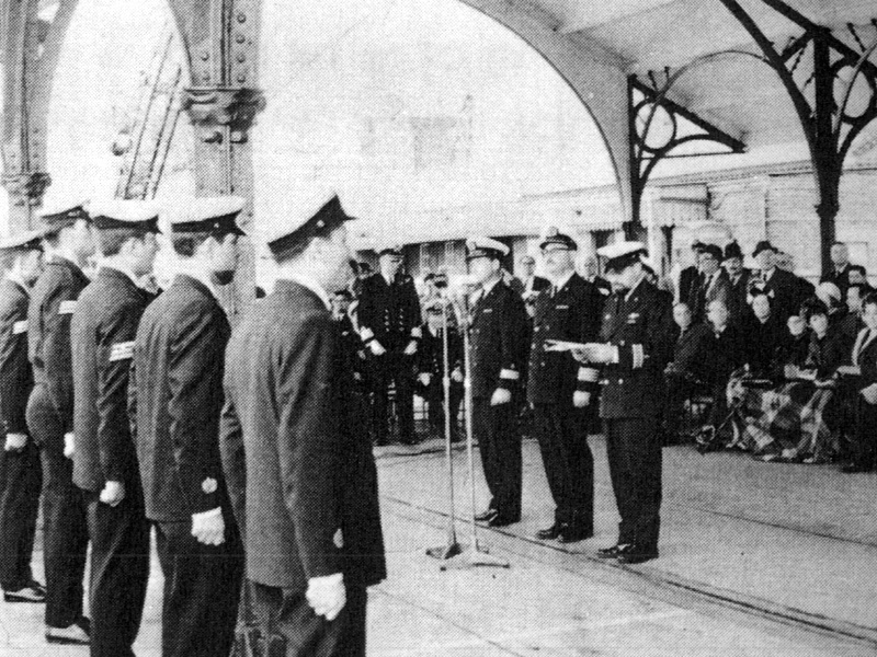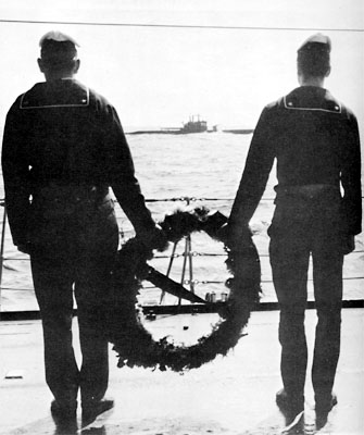 ימאים נושאי זר על סיפון משחתת בטקס אזכרה לצוללת
